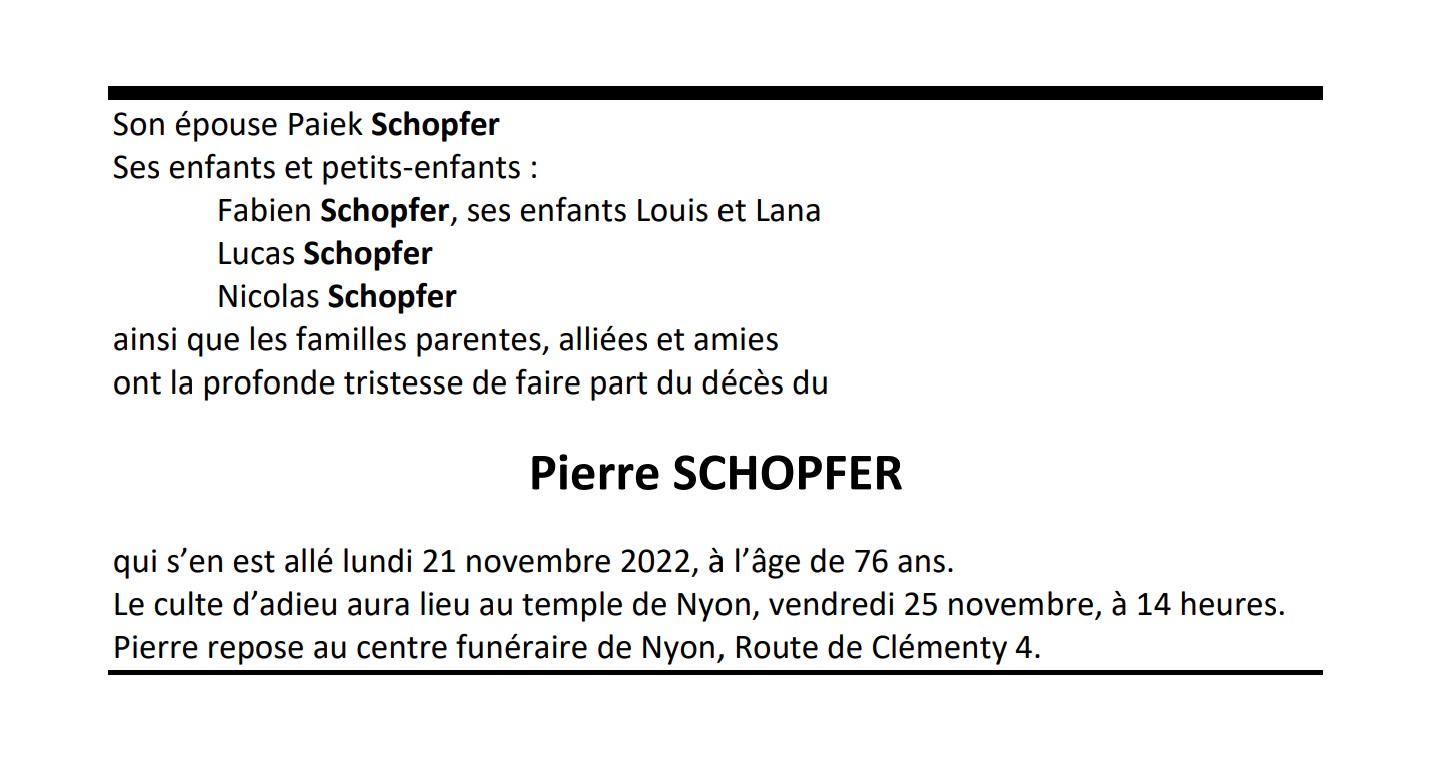 Pierre SCHOPFER 01 oct. 1946 - 21 nov. 2022 Avis mortuaire PFG Télecharger PDF Partager sur: Galerie PreviousNext PreviousNext