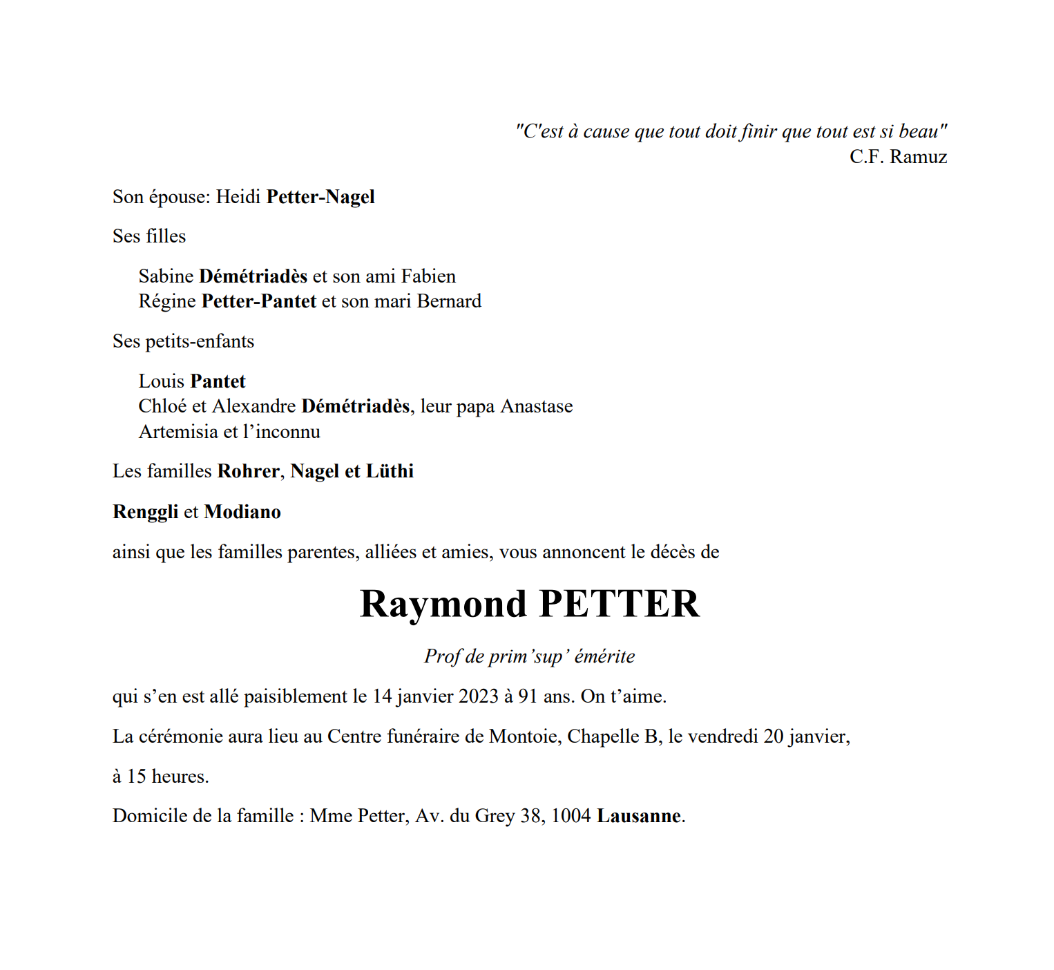 Raymond PETTER 13 sep. 1931 - 14 jan. 2023 Avis mortuaire PFG Télecharger PDF Partager sur: Galerie PreviousNext PreviousNext