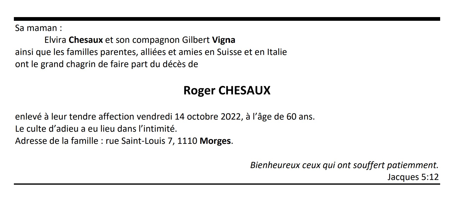 Roger CHESAUX 31 aoû. 1962 - 14 oct. 2022 Avis mortuaire PFG Télecharger PDF Partager sur: Galerie PreviousNext PreviousNext
