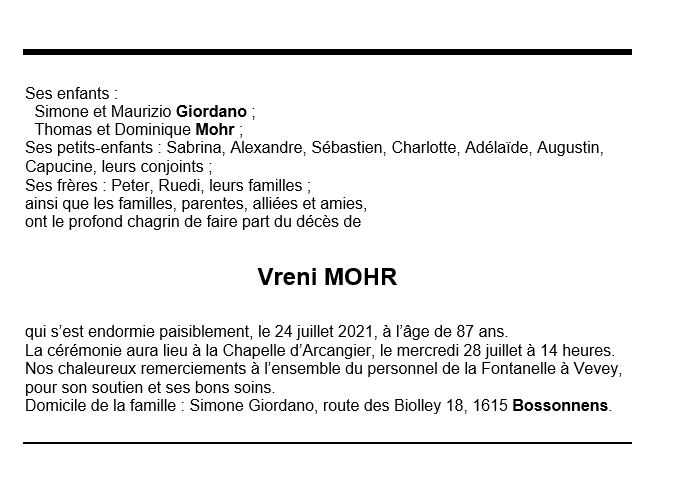 Vreni MOHR 05 juil. 1934 - 24 juil. 2021 Avis mortuaire PFG Télecharger PDF Partager sur: Galerie PreviousNext PreviousNext