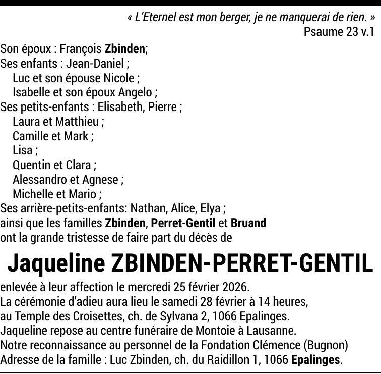 Madame Jaqueline ZBINDEN-PERRET-GENTIL