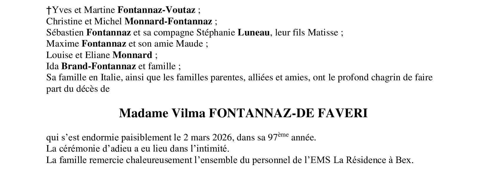 Madame Vilma FONTANNAZ-DE FAVERI